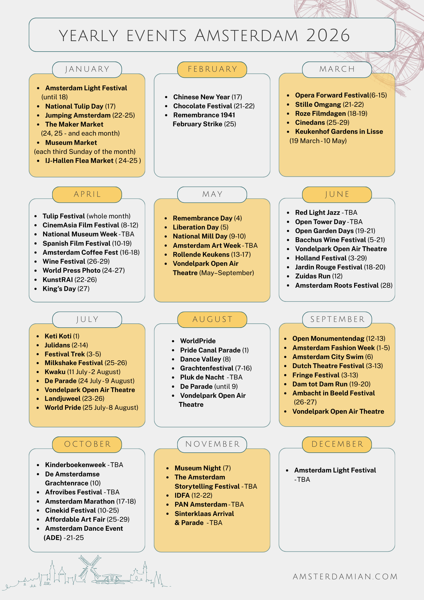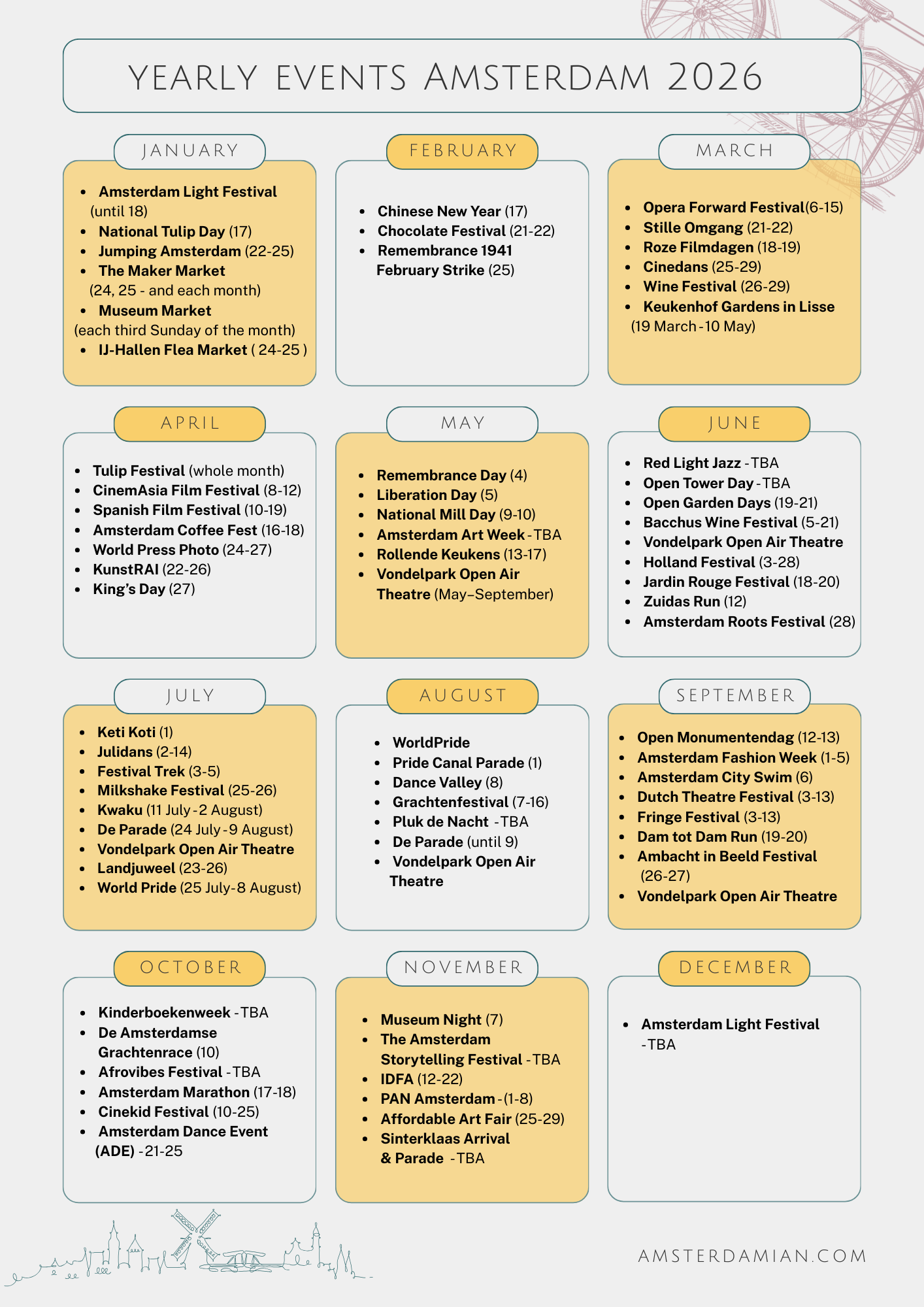 This guide brings together the main events in Amsterdam that happen every year. I’ve grouped them by month, to make it easier for you to plan your agenda. We don’t have the dates yet for some of them, but I’ll update the article as they become available.