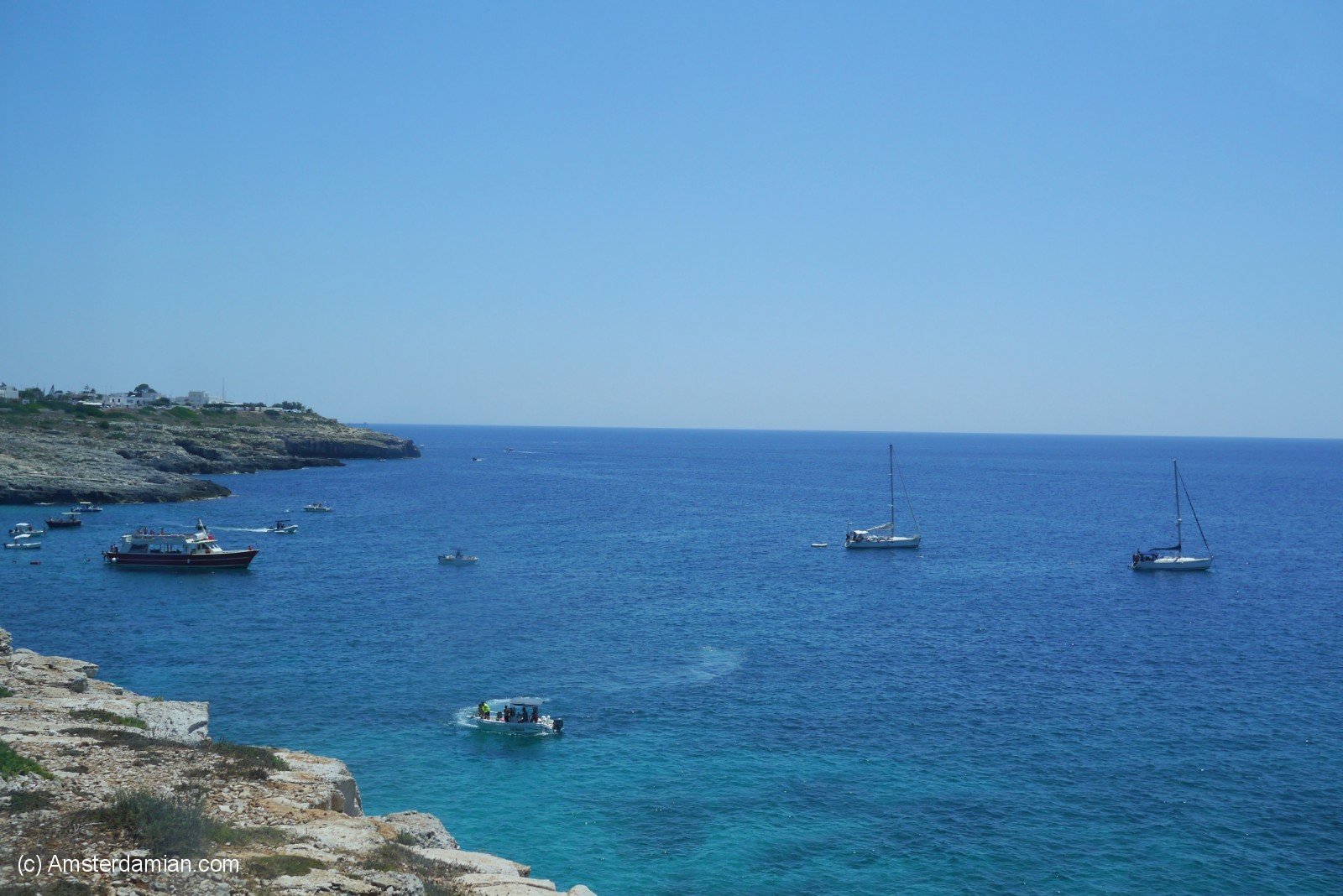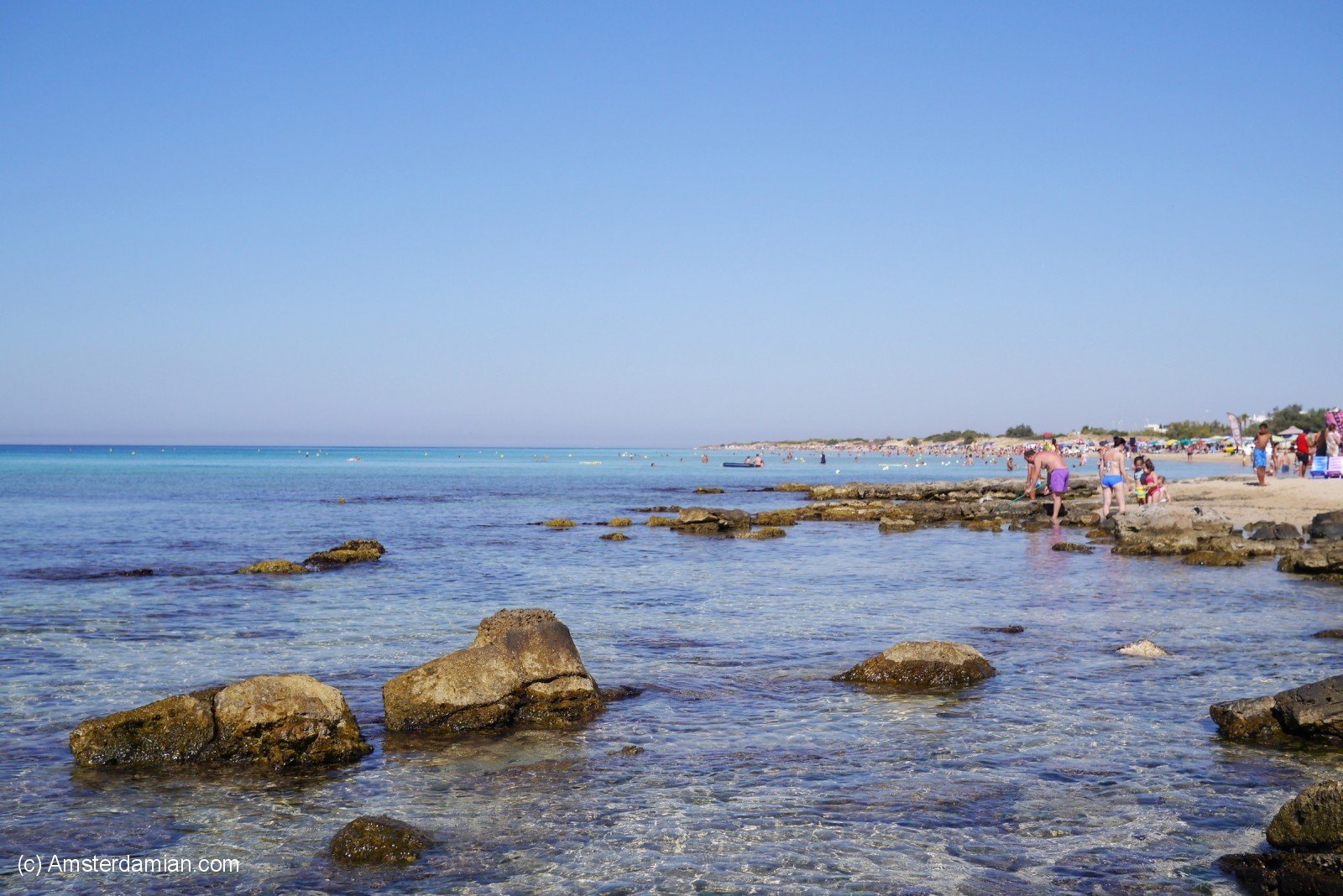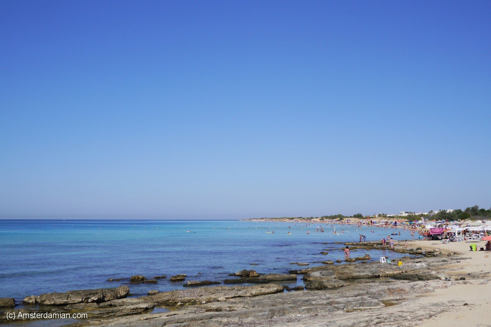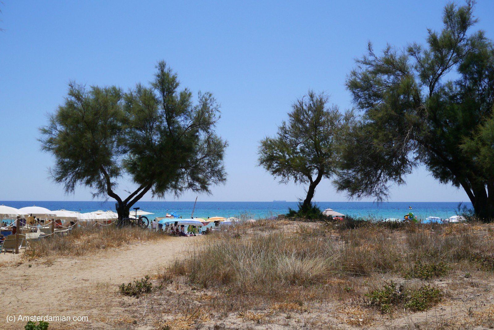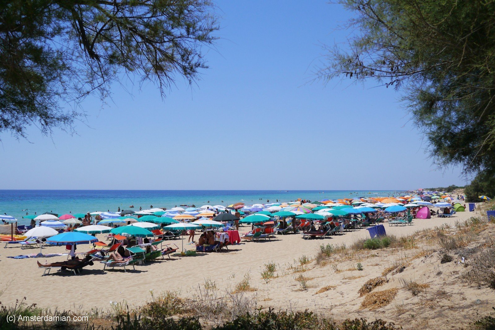 During my holiday in Italy, I spent a few days at the beach in the area called Madive del Salento (The Maldives of Salento). Famous for its amazing blue waters and golden sandy beaches, this area stretches from Torre Pali to Pescoluse and all the way to Torre Vado. My hotel was situated in Torre Vado, but you can’t really tell where one seaside resort ends and the other one begins. There’s not much to say about the place itself — it’s just a bland seaside resort, suitable for families and for relaxation. But the sea — oh, the sea! As a friend once said, it shines in fifty shades of blue. The water is clear and clean, with a long shallow stretch; surrounded by sand dunes covered with trees, it can be accessed from multiple locations and it has all the facilities one would need.